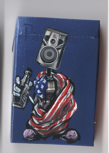 description: collage and acrylic on cigarette pack